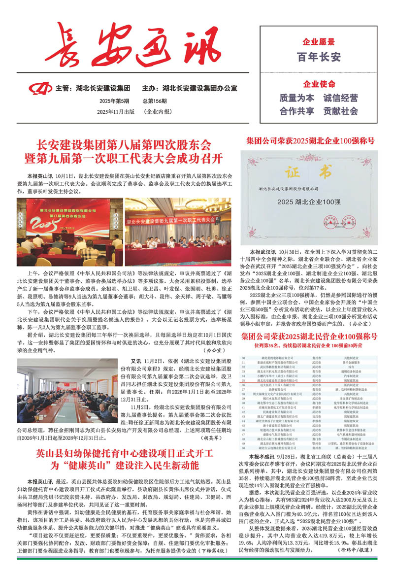 • 2025-11-03 長安建設集團聘任徐正新同志為湖北長安建設集團股份有限公司總經理、余招剛同志為英山縣長安房地產開發有限公司總經理